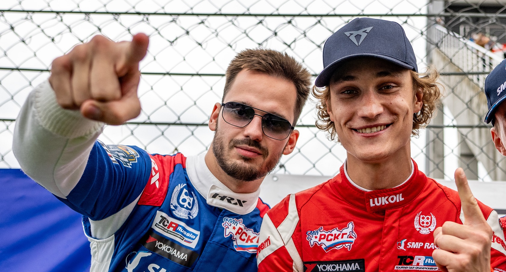 В топовом спринтерском классе SMP TCR Russia за титул сражаются Михаил Симонов и Александр Смоляр. Михаил (на фото справа) год назад с первой попытки стал лучшим, и сейчас тоже на первой строчке. Александр третий год подряд в силу разных обстоятельств дает фору соперникам, а потом героически их догоняет.